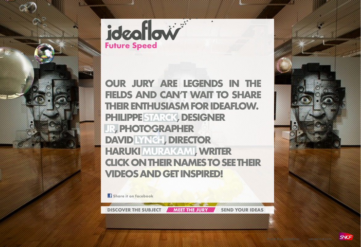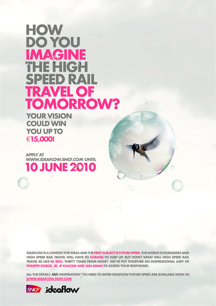Dans le cadre de la création d’un concours lancé par la SNCF sur le train du futur, j’ai imaginé et mise en image une identité et un site internet permettant d’envoyer ses créations en ligne. Doté d’un juré prestigieux, Stark, J.R. et Jean-Pierre Khazem, ce concours devait inspirer des étudiants en design, architecture, graphisme.