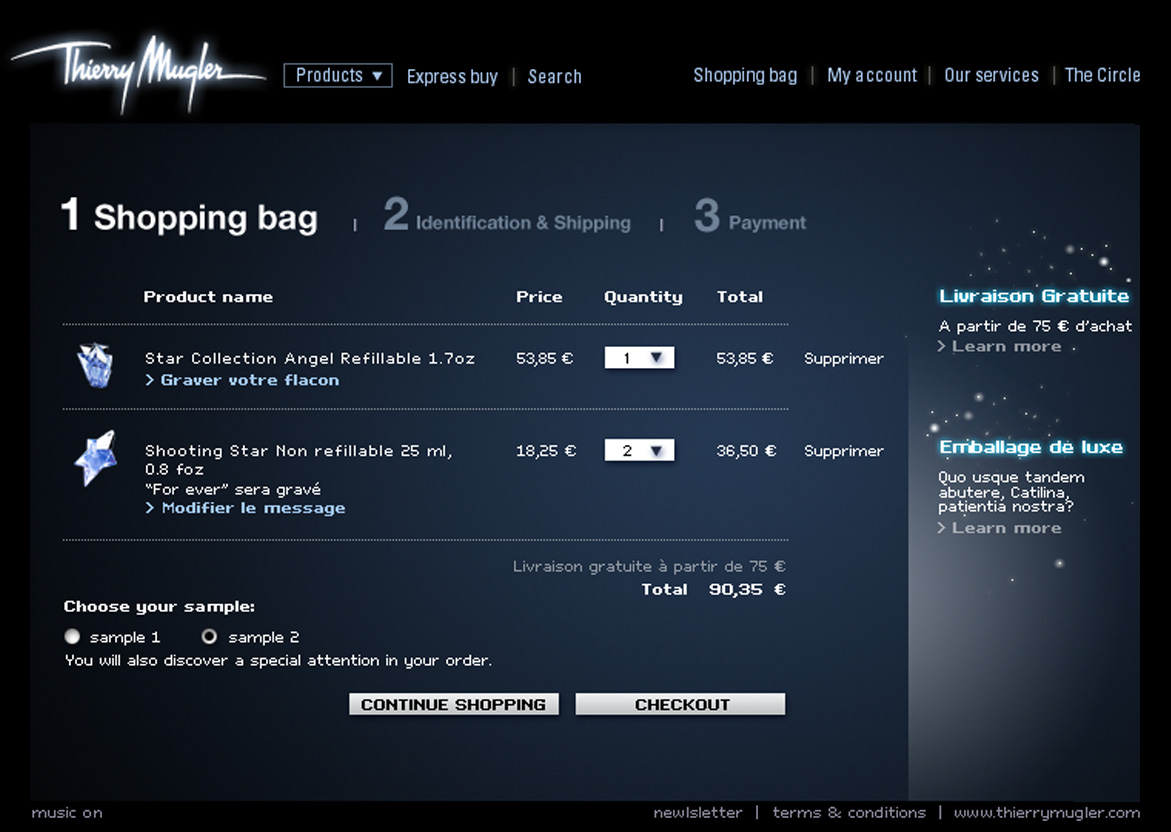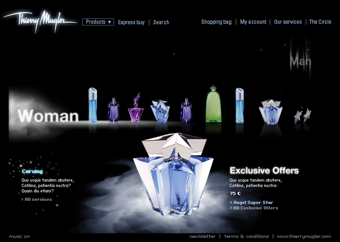 Thierry Mugler Boutiques en ligne, DA, Sites Web Création de la boutique en ligne. Un véritable univers de parfums, un design aérien et mystérieux. Similaire